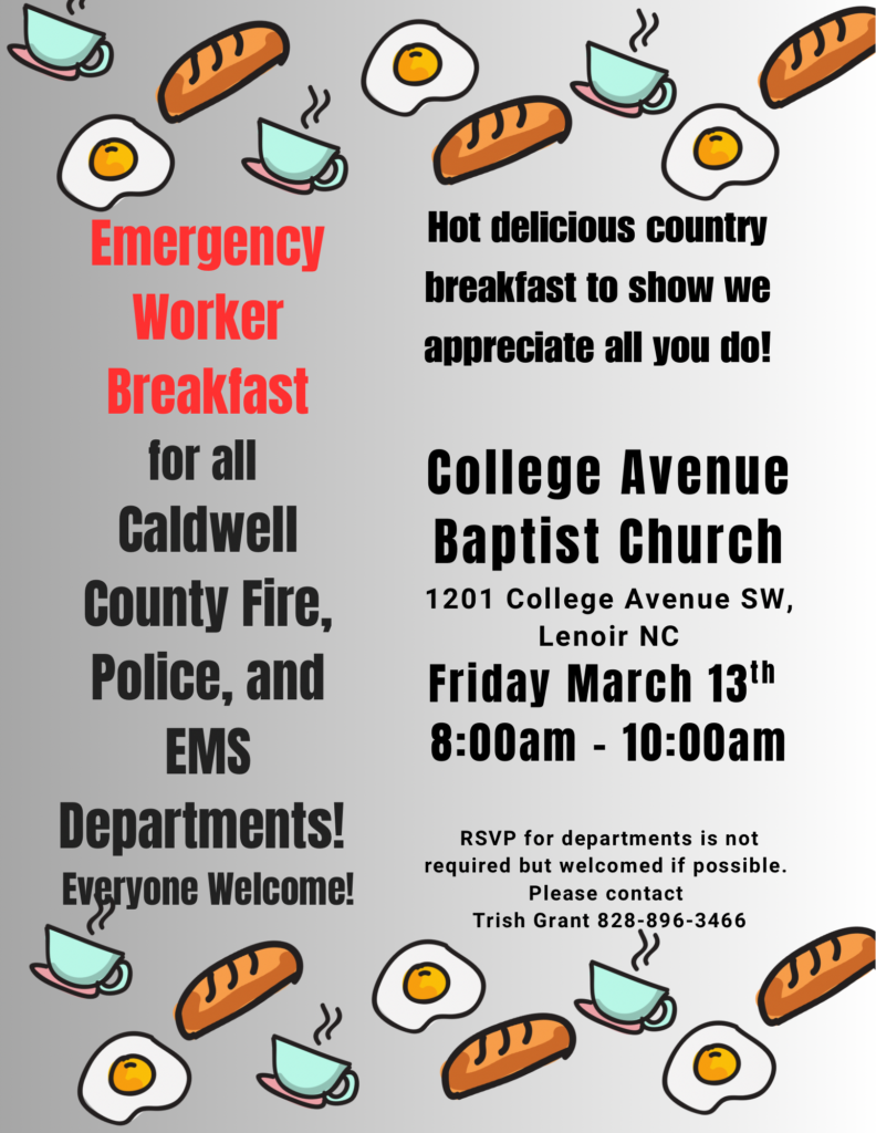 We will be honoring all Caldwell County Emergency Workers with a hot delicious breakfast on Friday, March 13th, from 8:00am-10:00am in our fellowship hall. We want to show our appreciation for all you do so please come and enjoy breakfast on us!
